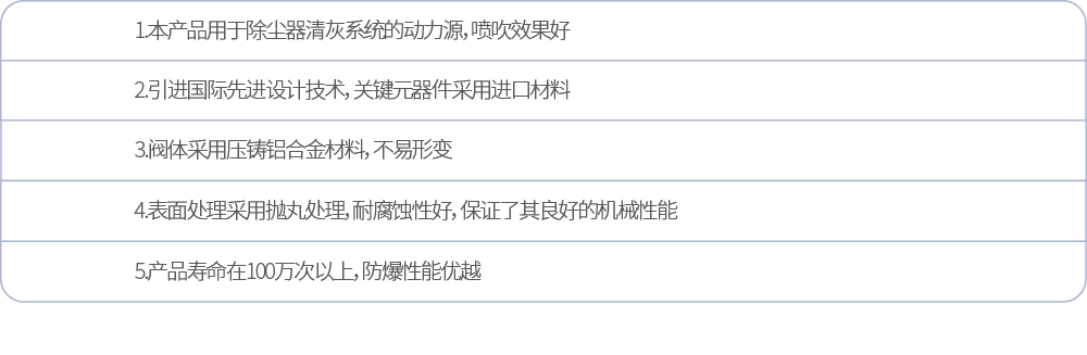 | RMF-Z-15M-EX(防爆) | Φ15mm | G1/2" | 0.3~0.8MPa | -5℃~+55℃ | <85% | 清潔空氣 | AC1100V/ AC220V/ DC24V | 噴吹100萬次以上 |