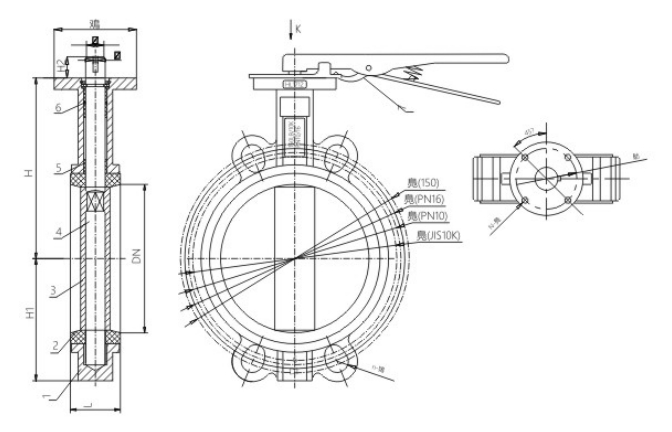 | 型號(hào) | DN | A | B | L | H | H1 | H2 | K | E | N-ΦD | ISO | PN10 | PN16 | CL150 | JSI10K | |||||